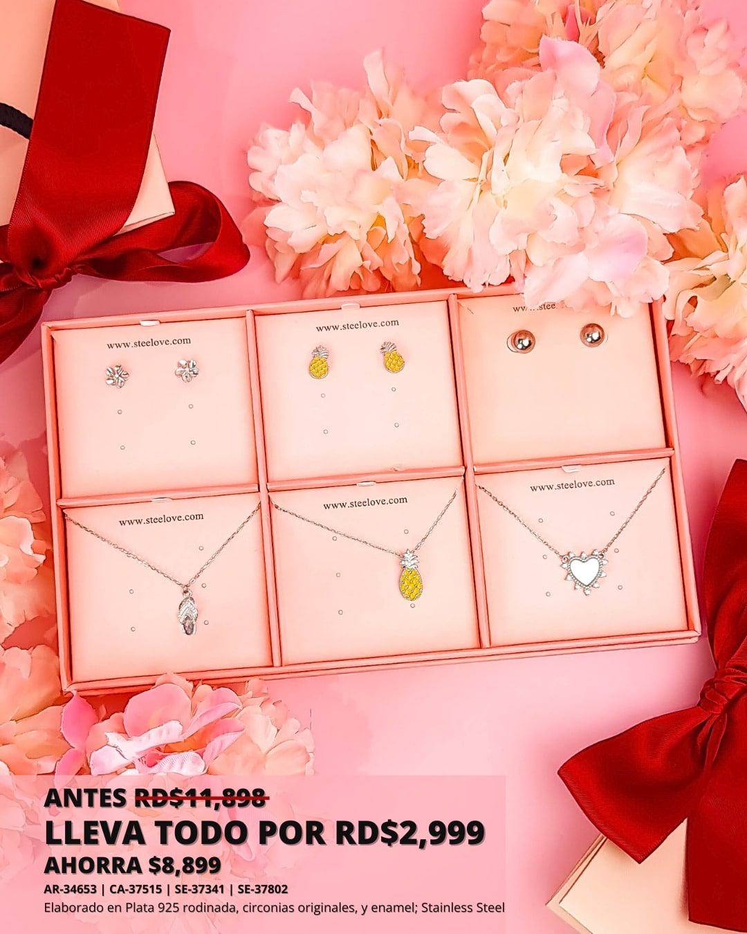 Plata 925 rodinada, circonias originales, y enamel; Stainless Steel